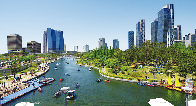 Songdo Central Park is a seawater park. The 1.8 km long waterway, designed to bring in seawater, shines in the sunlight. As one of Songdo’s main tourist attractions, it allows visitors to enjoy a water – taxi ride, water sports, and cycling. At night, the lights from the surrounding buildings and those illuminating the park create a stunning night view