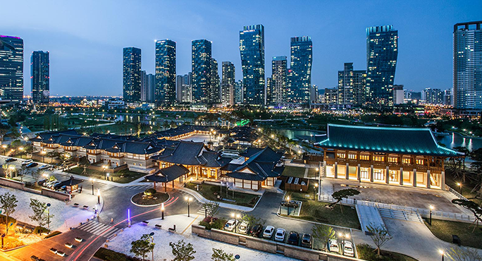 Songdo Hanok Village is a hanok village built in Songdo-dong, Yeonsu-gu, Incheon. It is not a village of old traditional houses but a hanok complex newly built in 2013. The contrast between the high-rise buildings of Songdo International City and the hanok complex creates a space where the West and the East meet. It is also known as the filming location for the dramas, attracting many visitors. The entire site of the hanok traditional village is leased to a 5-star Hanok hotel, Gyeongwonjae Ambassador Incheon and they provide programs for experiencing Korean traditional culture, including Hansik (Korean food), Hanbok (Korean traditional costume), and traditional games.