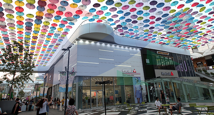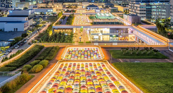 If you searched Songdo International City before your trip, you've probably seen pictures of beautiful streets with colorful umbrellas. This is Triple Street, where things to see, eat, and enjoy are in perfect harmony. It is also characterized by the good structure of the restaurants and lifestyle shops everywhere. The movie theater, bowling alley, and roof garden in Building D offer a different pleasure of shopping. Also, as a walkable shopping mall that considers pedestrians, you can go from Building A to Building D without crossing the crosswalk through the overpass on the second floor.