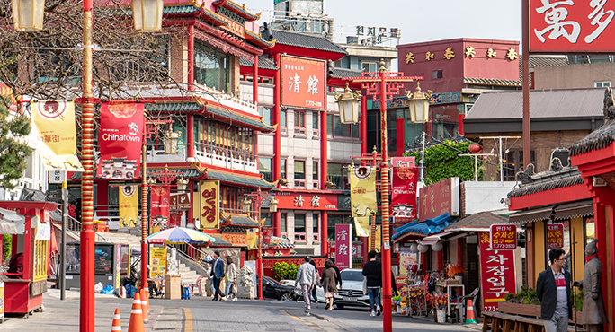 Incheon Chinatown, established after the opening of the port and the development of Incheon Station, lets you get a taste of China without leaving Korea. It is the only official Chinatown on the Korean peninsula, and one of the earliest, having formed in 1884. There are a number of restaurants and tourist attractions in the area. The streets are filled with colorful buildings in Chinese style, harmonizing red and gold colors. It is also a great place to try Koreanized Chinese food.