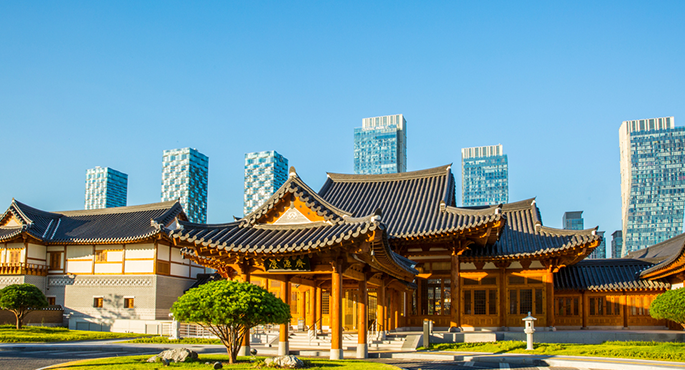 Songdo Hanok Village is a hanok village built in Songdo-dong, Yeonsu-gu, Incheon. It is not a village of old traditional houses but a hanok complex newly built in 2013. The contrast between the high-rise buildings of Songdo International City and the hanok complex creates a space where the West and the East meet. It is also known as the filming location for the dramas, attracting many visitors. The entire site of the hanok traditional village is leased to a 5-star Hanok hotel, Gyeongwonjae Ambassador Incheon and they provide programs for experiencing Korean traditional culture, including Hansik (Korean food), Hanbok (Korean traditional costume), and traditional games.